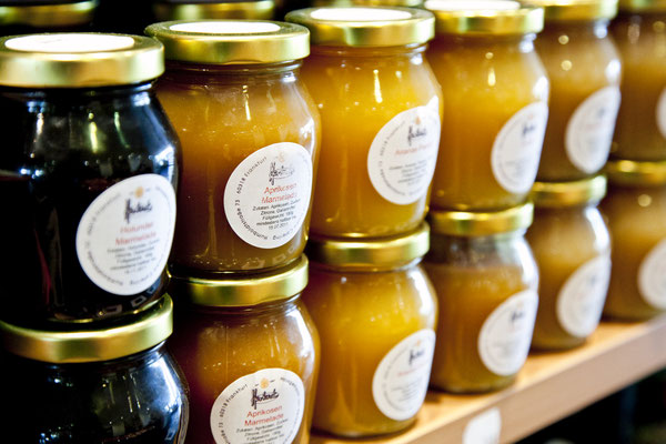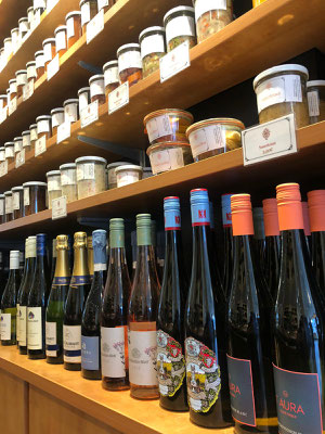 Des Weiteren bieten unsere Regale alle Speisekammer-Grundlagen, hausgemachte Konserven und Marmeladen, nach Kundenwünschen gefertigte Geschenkkörbe, sowie Weine und Sekt.